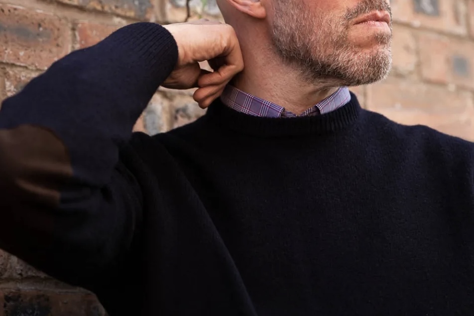 I bought another sweater, made by Barbour (below). It’s a simple navy crew neck in 100% lambswool, with alcantara elbow patches. People have mixed feelings about elbow patches. Some say they must be earned, i.e. not present unless covering an actual hole. Others, including me, take the view that they make a sweater feel more rugged and functional, changing the aesthetic while simultaneously increasing longevity.