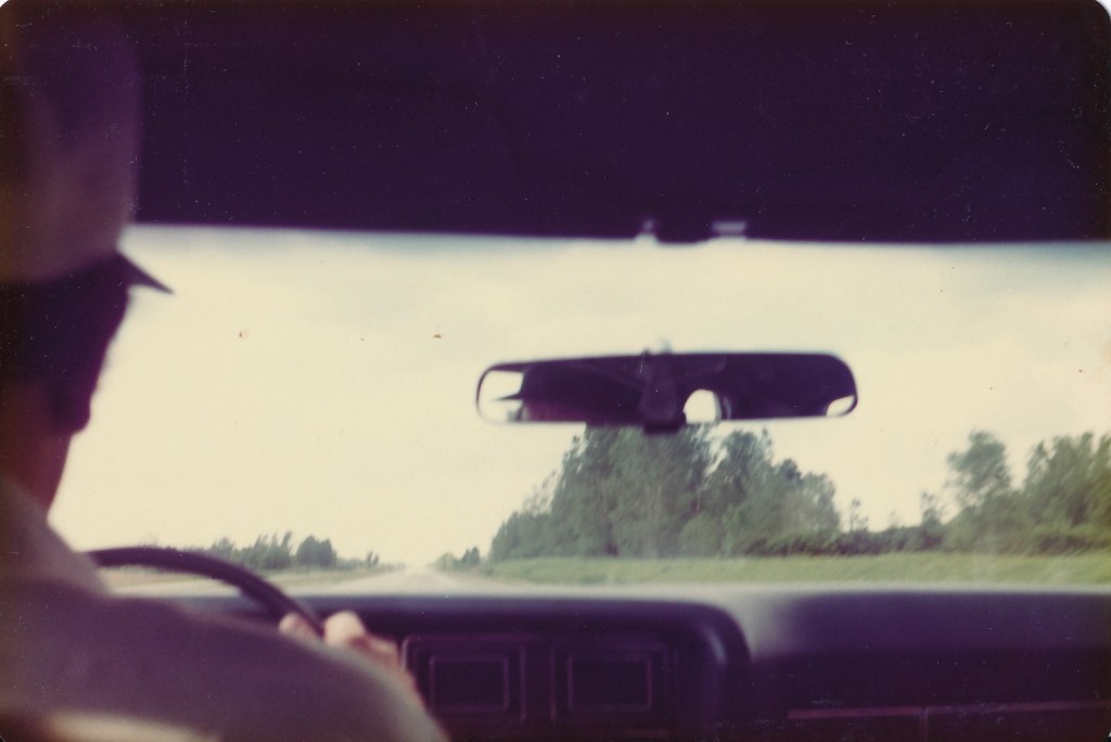 Another recurring motif is the car interior, featuring the rear view mirror. I really like the one below. I’m tempted to conclude I took it, as I would usually ride in the back seat while my mum was next to Dad in the front. I could be wrong though. This was a holiday, so perhaps I was up front enjoying the view of a long, straight American highway. Other similar pictures exist from more recent holidays after I had left home, which suggests this was a favourite composition Mum liked to use.