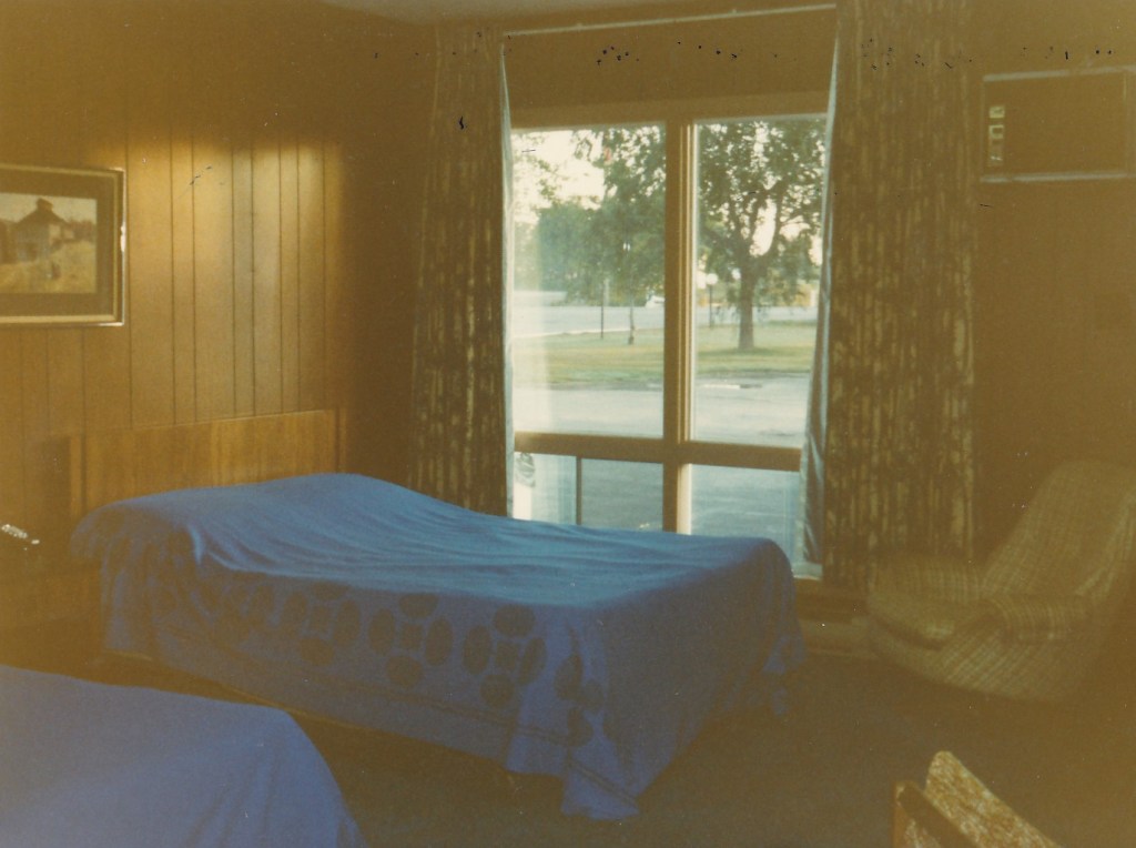 Below is another bed shot, taken in some motel room in the US. This one is superb, and particularly interesting to me because of the Shore/Eggleston feel to it. The composition is really neat with the beds and the panelled walls in the foreground, leading us out past the curtains and through the window. Mum isn’t on the bed, so I’m not sure who took this, but again, what were they trying to show? Was it the light on the panelling, the soft shadowy ripples on the bed by the window, or the uninspiring view outside? I think this is another example of someone being compelled by an artistic impulse to capture the moment, and they succeeded.